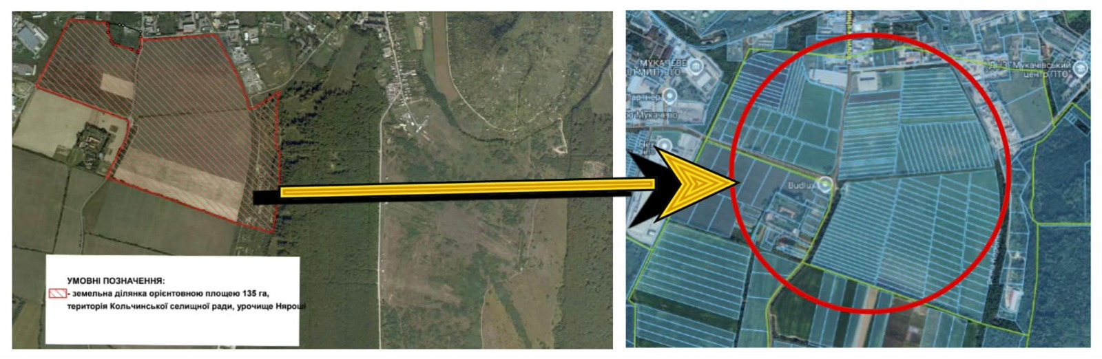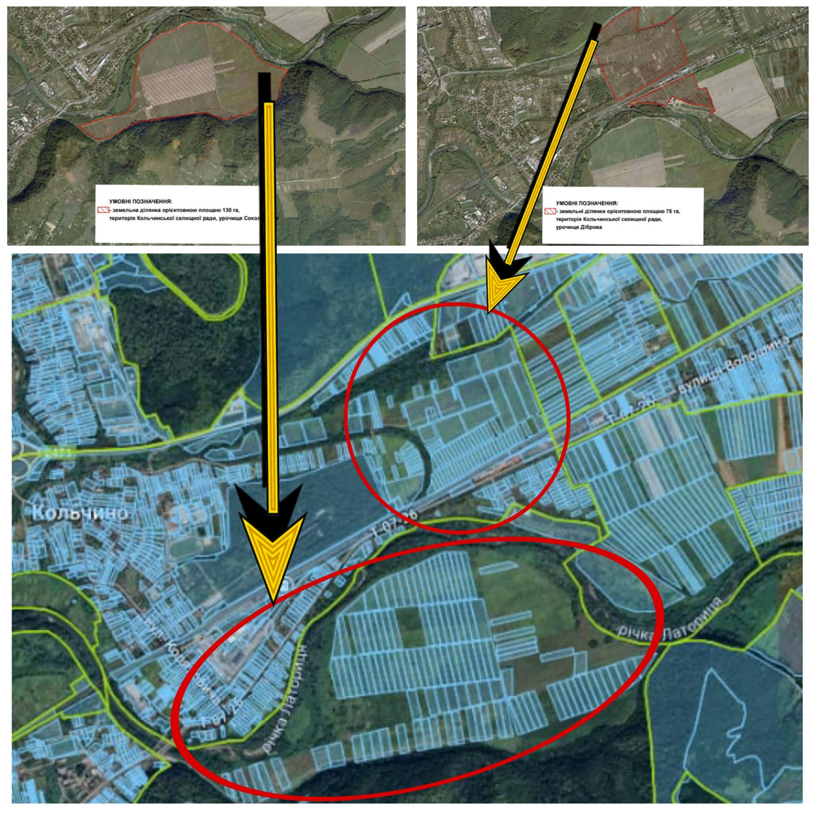 Якщо порівняти обрані території із доступними сьогодні кадастровими даними (https://kadastr.live/, https://kadastrova-karta.com/ , а також даними Державного земельного кадастру – ред.) видно, що пропоновані території – десятки ділянок сільськогосподарського призначення у приватній власності. Втім у самій Кольчинській селищній раді зазначають: території обрані з тих підстав, що вони розташовані неподалік населених пунктів, біля них вже є розвинуті інстраструктурні мережі, рельєф цих територій дозволяє проєктувати промислові підприємства, а самі власники земельних ділянок, зокрема в урочищі «Няроші», не проти їх продати чи віддати у оренду для таких об’єктів.