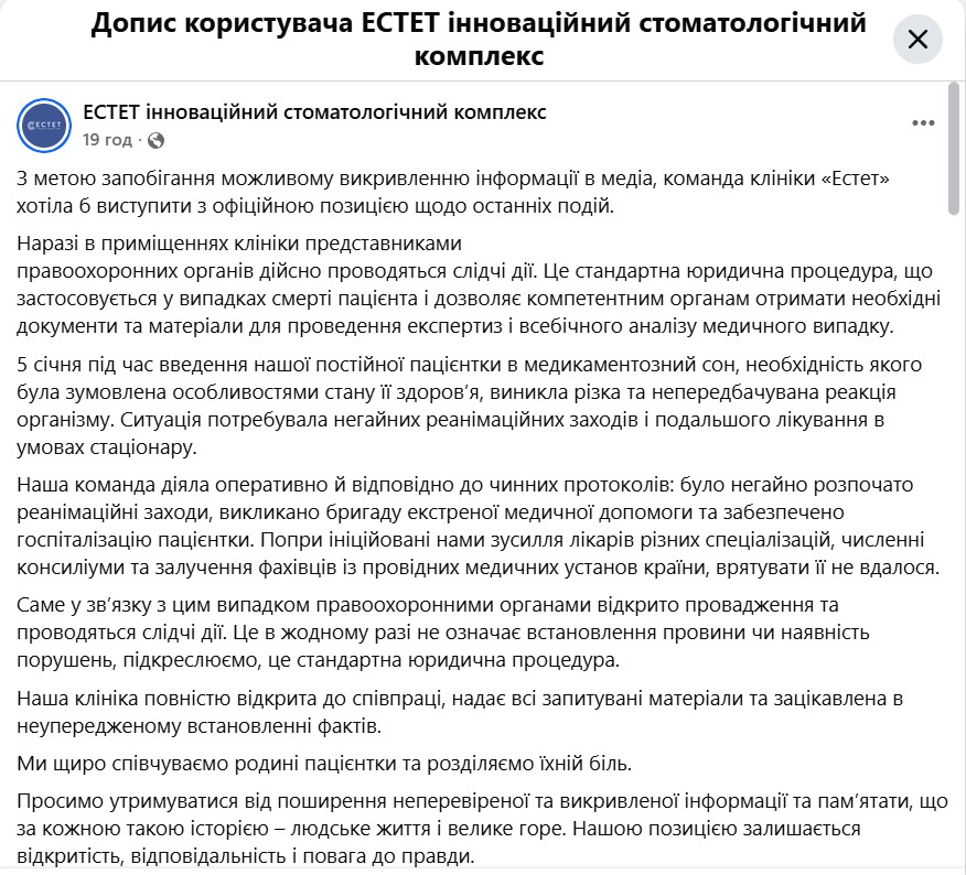 Стоматологічна клініка «Естет», де після стоматологічного втручання померла 12-річна дівчинка, оприлюднила розширену офіційну заяву на своїй сторінці у Facebook. У клініці повідомили, що наразі в її приміщеннях представники правоохоронних органів проводять слідчі дії. За словами медзакладу, це стандартна юридична процедура у випадках смерті пацієнта, необхідна для збору документів і проведення експертиз.