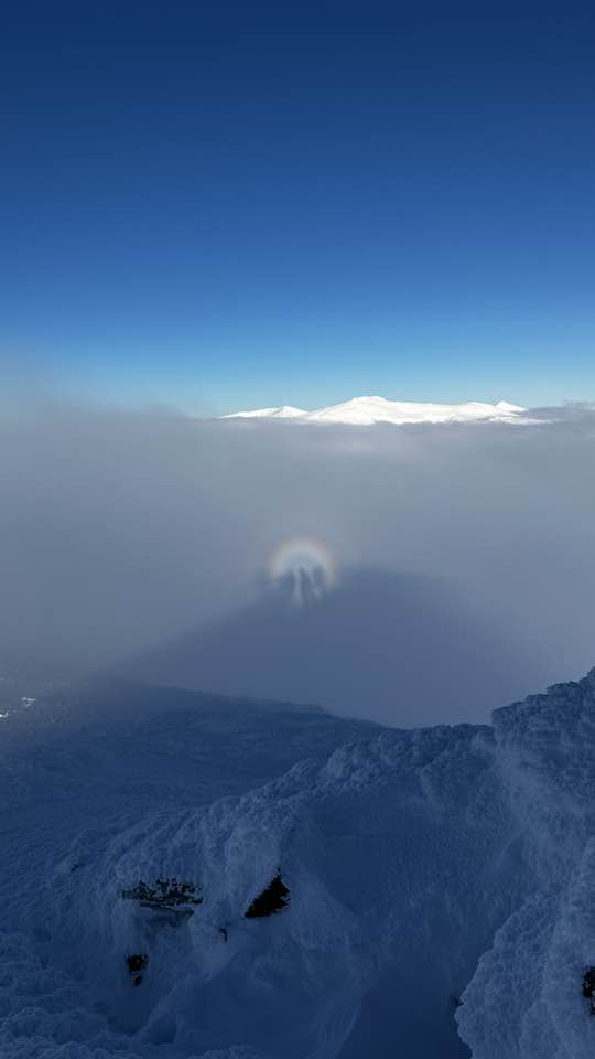 На знімку видно темний силует людини, який ніби ширяє над туманом, а навколо нього — світлий райдужний ореол. Насправді ж це природне оптичне явище. Воно виникає тоді, коли сонце перебуває низько за спиною спостерігача, а попереду — шар хмар або густого туману. Тінь людини проєктується на водяні краплі у повітрі, а через розсіювання світла утворюється так звана глорія — світлове кільце навколо силуету.
