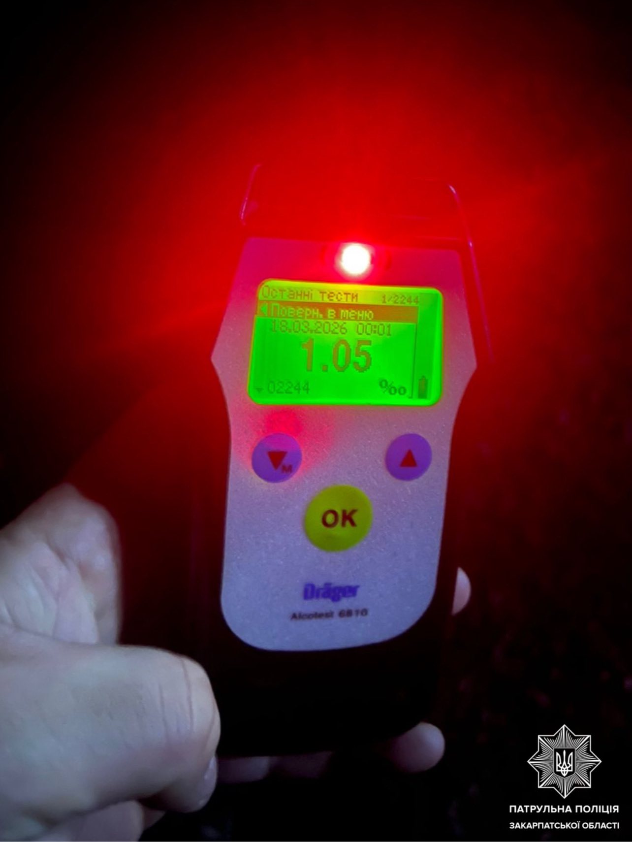 Під час спілкування з водійкою інспектори виявили у неї ознаки алкогольного сп’яніння. Жінці запропонували пройти огляд на місці зупинки. Результат тесту склав 1,05 проміле, що більш ніж у п’ять разів перевищує допустиму норму.
