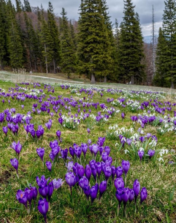 Цьогоріч у низинних районах Карпатського біосферного заповідника шафрани вже відцвіли — їхній пік припав на березень і початок квітня. Натомість у високогір’ї цвітіння лише набирає обертів.